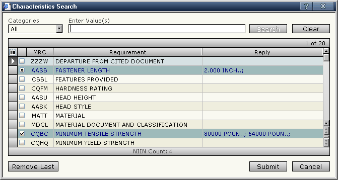 We repeat this process for thread length, thread pitch, and minimum tensile strength. During each cycle all lists are continuously refined. Only those choices which would yield a non-zero result are presented. The matching NIIN count is also updated at the end of each cycle. When all of the choices have been made, we are left with 4 bolts which meet our criteria.